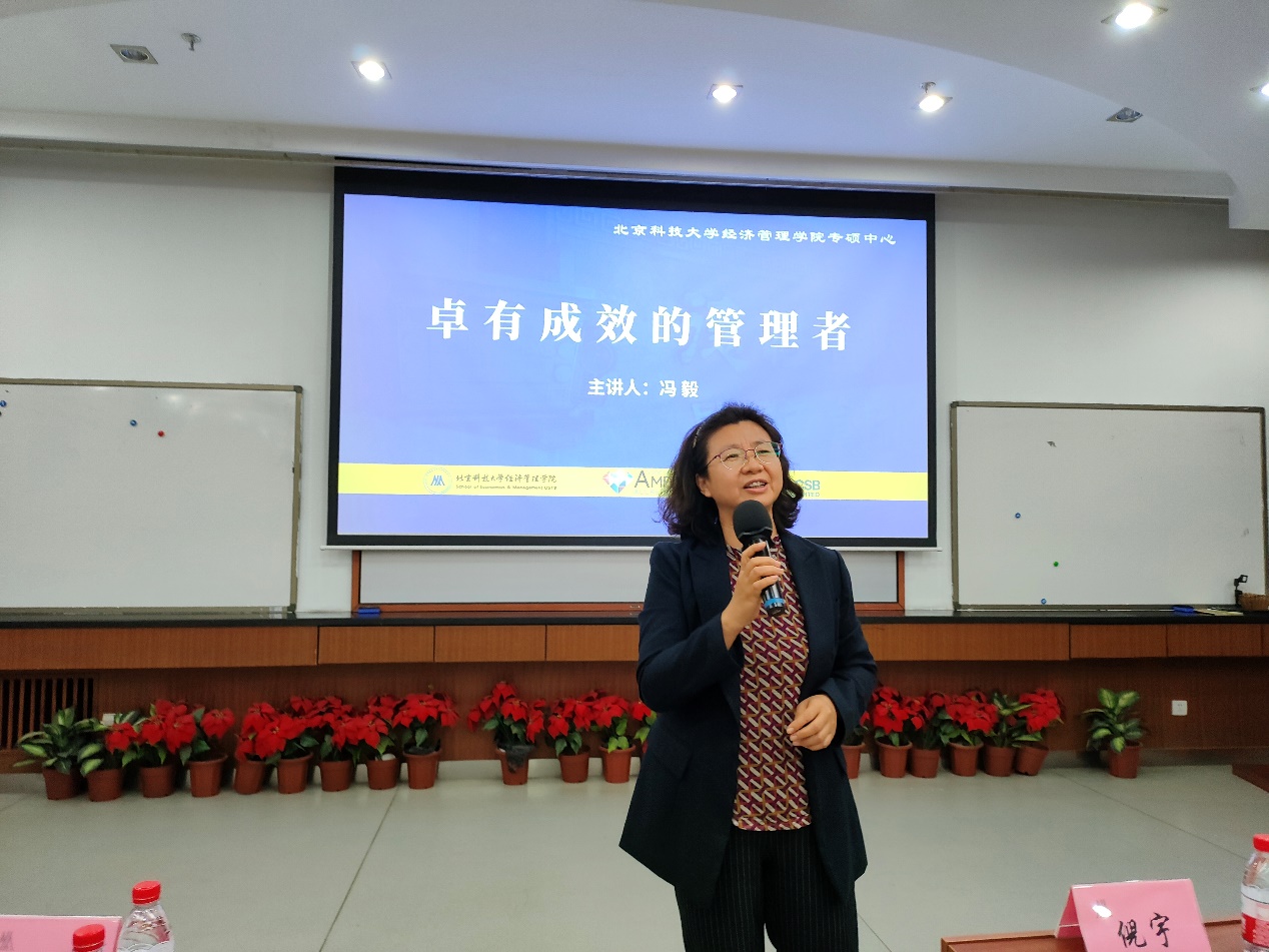 在冯毅分享结束后,工商管理系主任张剑发表了总结性发言。她表示,通过冯毅对彼得·德鲁克理论的解读和推进,更加深刻地认识到管理是一门科学。冯毅在将理论应用于实践的同时,也用实践的经验推动了管理思想的进步,采用上下结合的方式进一步推进了管理实践的进程。其次,张剑提到,彼得·德鲁克的经历告诉我们,作为一名优秀的管理者,要积极承担社会责任,关注社会需求,解决社会问题。这是管理的精髓所在,也是我们作为职业经理人应该具备的素质。